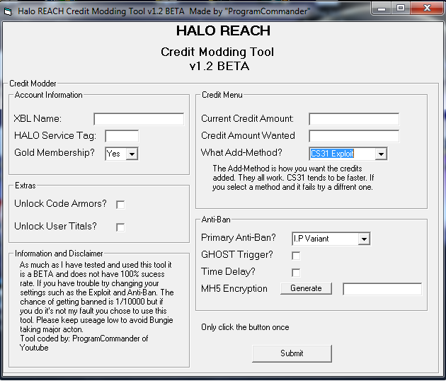 Made by me [ProgramCommander] this is currently the only working Halo REACH credit hack. Please don't download this from anyone else. Program will be out of BETA here in a few weeks.